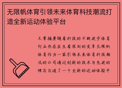 随着科技的不断进步,体育行业也在发生着深刻的变革。无限帆体育作为一家引领未来体育科技潮流的公司,通过创新的技术与先进的理念,打造了一个全新的运动体验平台。该平台不仅融合了人工智能、大数据分析、虚拟现实(VR)等尖端技术,还致力于提升运动员的训练效果、观众的互动体验以及体育行业的商业模式。在未来,随着技术的发展和平台功能的不断拓展,无限帆体育将进一步推动全球体育产业的革新,并成为未来体育科技的领导者。本文将从四个方面详细探讨无限帆体育如何引领体育科技潮流,并分析其对未来运动体验的深远影响。