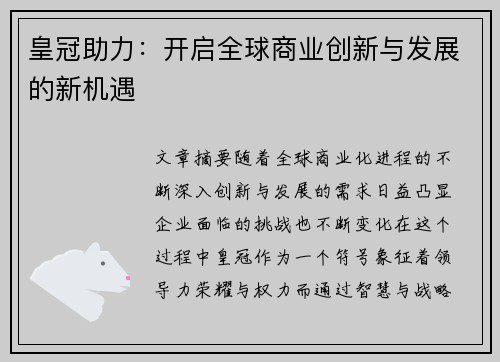 皇冠助力:开启全球商业创新与发展的新机遇