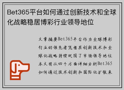 Bet365平台如何通过创新技术和全球化战略稳居博彩行业领导地位